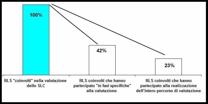 - gli RLS coinvolti,che dichiarano anche di aver partecipato “a fasi specifiche”(quindi non solo nell’ambito di momenti formali, come di fatto è la riunione periodica) scendono al 42% del totale degli intervistati e purtroppo al 23% del totale quando specificano che la loro partecipazione è stata “nella realizzazione dell’intero percorso di valutazione del rischio Slc”.