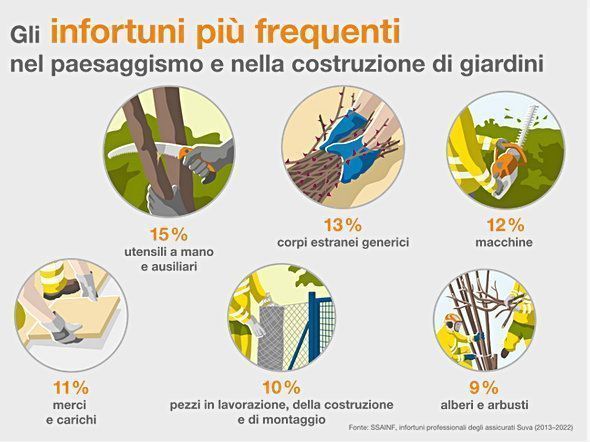 Il sito sottolinea che in Svizzera gli infortuni più frequenti “riguardano le ferite causate da utensili a mano e ausiliari, dal taglio di alberi e arbusti e quelle dovute a un uso improprio delle macchine”.