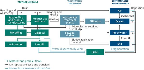 Tra le fonti di rilascio di microplastiche vi sono anche gli indumenti, che le rilasciano soprattutto durante il lavaggio ma non solo, come mostra la figura sottostante. Le vie di rilascio delle microplastiche prodotte dai tessuti non si limitano ad impattare l'acqua dolce e marina ma anche l'aria e il suolo. Inoltre, come si può vedere sempre dall'immagine che segue, le microplastiche possono essere rilasciate in qualsiasi punto della "catena" tessile: dalla produzione all'uso e cura fino allo smaltimento.