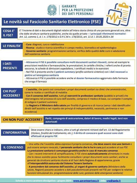Un'infografica del Garante della protezione dei dati personali fornisce alcuni chiarimenti sul Fascicolo Sanitario Elettronico: cos'è, chi può accedere, quali dati contiene?