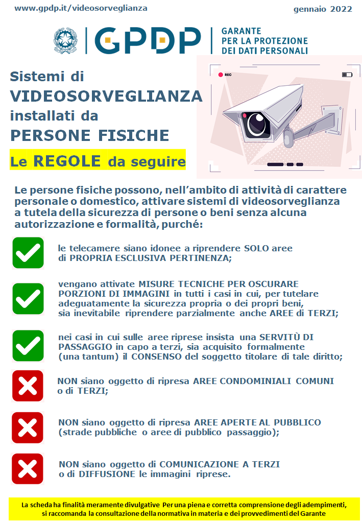 Il Garante per la protezione dei dati personali ha riassunto in una scheda informativa le principali indicazioni per le persone fisiche che intendono installare, in ambito personale o domestico, sistemi di videosorveglianza a tutela della sicurezza di persone o beni.