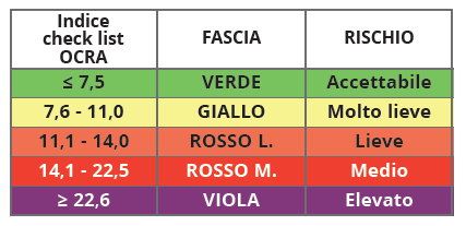 È stata valutata una parte rappresentativa (1 minuto) del ciclo lavorativo con riferimento all’indice check list OCRA che riprendiamo: