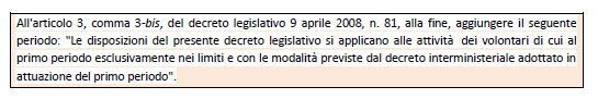 3-bis. Nei riguardi delle cooperative sociali di cui alla legge 8 novembre 1991, n. 381, e delle organizzazioni di volontariato della protezione civile, ivi compresi i volontari della Croce Rossa Italiana e del Corpo Nazionale Soccorso Alpino e Speleologico, e i volontari dei Vigili del Fuoco, le disposizioni del presente decreto legislativo sono applicate tenendo conto delle particolari modalità di svolgimento delle rispettive attività, individuate entro il 31 dicembre 2010 con decreto del Ministero del lavoro, della salute e delle politiche sociali, di concerto con il Dipartimento della protezione civile e il Ministero dell’interno, sentita la Commissione consultiva permanente per la salute e sicurezza sul lavoro. Le disposizioni del presente decreto legislativo si applicano alle attività dei volontari di cui al primo periodo esclusivamente nei limiti e con le modalità previste dal decreto interministeriale adottato in attuazione del primo periodo.