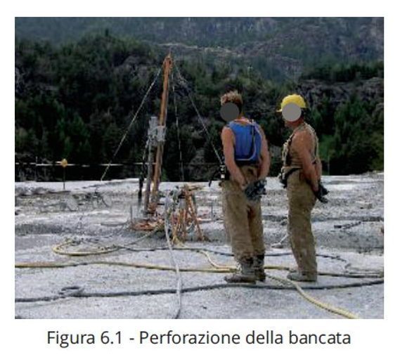 Mentre la fase successiva di distacco della bancata assume caratteristiche differenti a seconda del litotipo, della roccia: “taglio con filo diamantato o mine direzionate a brillamento simultaneo per il serpentino ‘massiccio’; mine direzionate e tagli laterali di apertura con filo diamantato per il serpentinoscisto”.