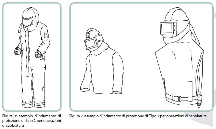 È dunque importante che durante tutte le operazioni di sabbiatura l’operatore addetto “utilizzi lo specifico ‘completo per sabbiatura’, costituito da un ‘kit’ d’indumenti di protezione che proteggono dai rischi che insorgono durante le operazioni di sabbiatura, ed equipaggiamento di protezione delle vie respiratorie.