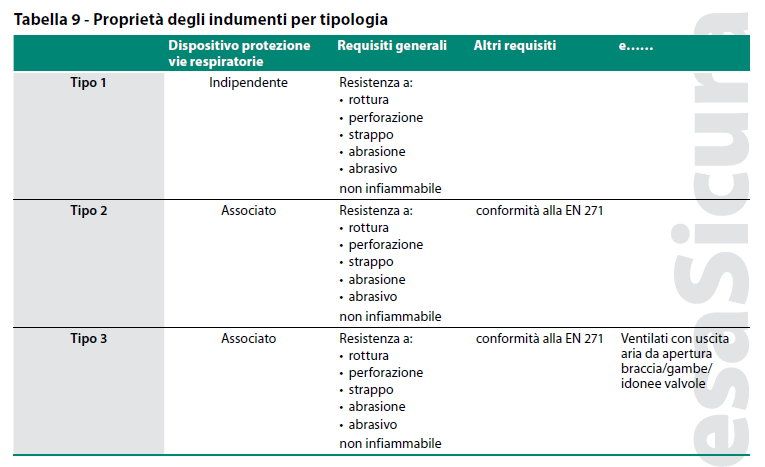 Riguardo ai requisiti degli indumenti protettivi per operazioni di sabbiatura con abrasivi in grani è poi presente una tabella che riporta le proprietà degli indumenti per tipologia (“gli indumenti di protezione per operazioni di sabbiatura, che proteggono il corpo o parte di esso sono stati classificati in Tipo 1, Tipo 2 e Tipo 3”):