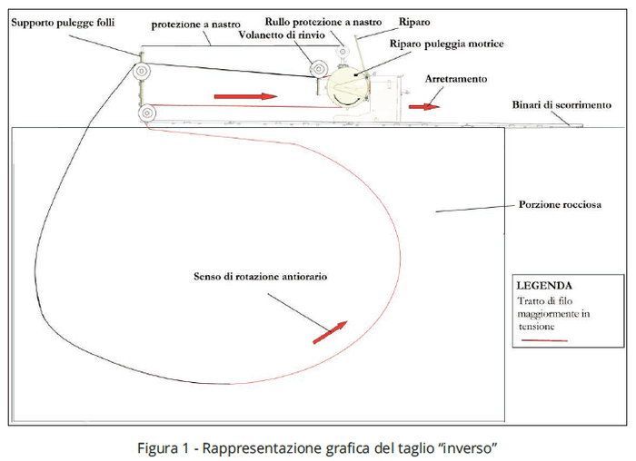 Riguardo alla dinamica dell’infortunio si indica che il giorno dell’infortunio nel piazzale della cava “era in corso un taglio di isolamento di una bancata di marmo al monte con macchina tagliatrice a filo diamantato installata sopra e a lato della bancata da isolare”. E il taglio in corso “veniva realizzato nella configurazione di taglio inverso con volanetti di rinvio”.