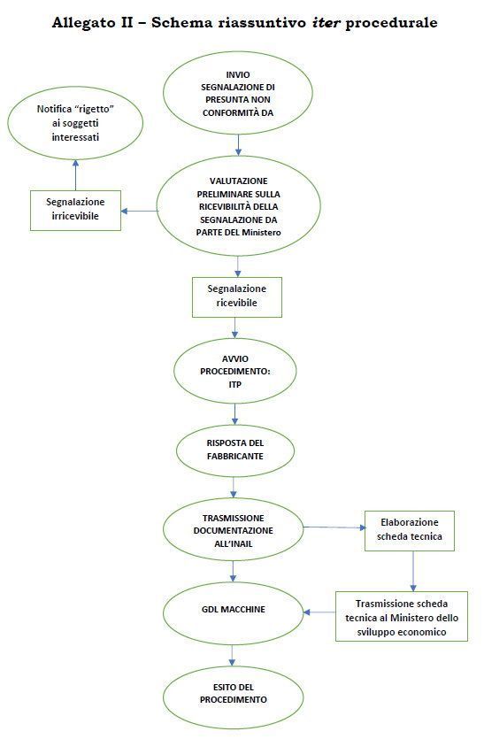Si indica poi che, in modo conforme a quanto previsto dal già citato articolo 6 del d.lgs. 17/2010, la documentazione esibita dal fabbricante “viene trasmessa all’Istituto Nazionale per l’Assicurazione contro gli Infortuni sul Lavoro (INAIL) - Dipartimento Innovazioni Tecnologiche e Sicurezza degli Impianti prodotti e insediamenti antropici, per la redazione della scheda di carattere tecnico, in ordine alla conformità della macchina - limitatamente alla situazione di pericolo segnalata e con riferimento ai RES indicati dall’OVT – sottoscritta dal funzionario referente della pratica, dal Responsabile dell’Unità Accertamenti Tecnici e dal Responsabile del Dipartimento”. La scheda tecnica viene poi “analizzata ed approfondita in seno al Gruppo di Lavoro Macchine (GdL), istituito presso il Ministero dello sviluppo economico e composto dai rappresentanti qualificati nello specifico settore del Ministero dello sviluppo economico, del Ministero del Lavoro e delle Politiche Sociali, del Coordinamento Tecnico Interregionale, dell’INAIL, con l’emissione di un parere in ordine all’esito dell’accertamento tecnico in esame. Tale parere, viene comunicato dal Ministero dello sviluppo economico al fabbricante, all’OVT segnalante, al Ministero del Lavoro e delle Politiche Sociali, all’INAIL e, ove necessario, al Coordinamento Tecnico Interregionale, nonché all’Organismo Notificato che ha rilasciato la certificazione CE di tipo, nel caso di macchine comprese nell’Allegato IV”.