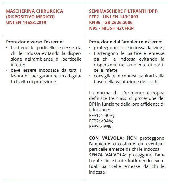 Il documento si sofferma anche sulle modalità di utilizzo: “i dispositivi di protezione delle vie respiratorie devono aderire al volto ed essere indossati correttamente (leggere attentamente le istruzioni). Questi dispositivi devono coprire correttamente il naso, la bocca e il mento e devono fornire una tenuta adeguata sul viso del portatore, anche quando esso muove la testa”.