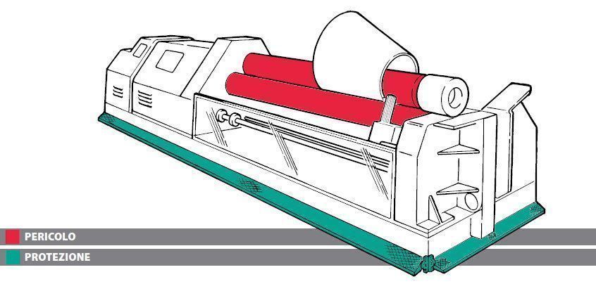 - schiacciamento, trascinamento, impigliamento: “la zona di imbocco dei cilindri (o rulli) è quella più pericolosa e dovrebbe essere efficacemente protetta per tutta la sua estensione, con riparo per impedire la presa e il trascinamento delle mani o altre parti del corpo del lavoratore. Tali protezioni possono essere costituite da ripari fissi” o da ripari mobili interbloccati. Tuttavia poiché, per necessità di lavorazione, “questi tipi di ripari non sono sempre applicabili, la macchina deve essere dotata di un dispositivo a fune o barra contornante la zona pericolosa che l’operatore può azionare da qualsiasi posizione con una facile manovra al fine di conseguire il rapido arresto dei cilindri”. E la fune o barra “deve essere collegata a finecorsa di sicurezza” in modo da “provocare l’arresto della macchina nel caso venga azionata dall’operatore. Nelle calandre che presentano rischi particolarmente gravi il dispositivo di arresto d’emergenza” a fune o barra “deve conseguire l’arresto immediato dei cilindri (motore autofrenante) e la contemporanea inversione del moto o allontanamento dei cilindri. Inoltre, per quanto necessario ai fini della sicurezza e tecnicamente possibile, il lavoratore deve essere fornito e fare uso di appropriati attrezzi che gli consentano di eseguire le operazioni senza avvicinare le mani alla zona pericolosa;