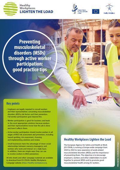 Agenzia europea per la sicurezza e la salute sul lavoro, “ Preventing musculoskeletal disorders (MSDs) through active worker participation: good practice tips”, documento in lingua inglese correlato alla campagna europea “Ambienti di lavoro sani e sicuri. Alleggeriamo il carico!” (formato PDF, 769 kB).