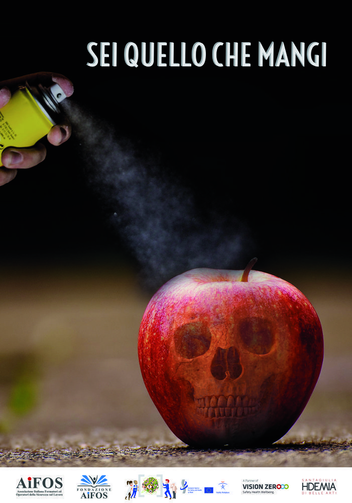 L’attenzione per le sostanze pericolose riguarda anche il settore alimentare. Questo manifesto, raffigurando un simbolico gesto, ci ricorda come sia importante ricordare che le sostanze pericolose sono contenute anche negli alimenti. La mela, che tipicamente nelle pubblicità e nelle campagne di prevenzione e salute è simbolo per eccellenza di salute e benessere, in questo contesto ricorda invece la mela avvelenata della celebre fiaba di Biancaneve. Nessuna strega in questo caso agisce sul frutto, ma la mano dell’uomo che nella catena produttiva spesso può sottoporre gli alimenti a sostanze pericolose come pesticidi o conservanti. Il motto “sei quello che mangi” diventa lo slogan perfetto per un manifesto che vuole ricordare a tutti noi, quotidiani consumatori, come sia importante fare attenzione a ciò che consumiamo.