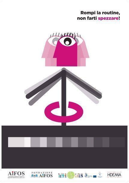 Il concetto di alienazione viene espresso rappresentando il profilo del capo di una persona con proporzioni maggiori rispetto al resto del corpo. L’occhio ed il colore utilizzato per il volto vogliono comunicare il senso di estraniamento provato in diverse situazioni durante il lavoro. Il corpo passa in secondo piano e viene rappresentato con una linea che viene spezzata solo nei punti dove si trovano le articolazioni coinvolte dal dolore. Quest’ultimo viene evidenziato da elementi dello stesso colore del volto, per legare l’influenza che il dolore ha non solo sul corpo, ma anche sulla nostra mente ed emotività.