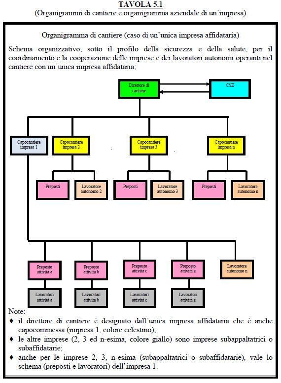 Riprendiamo una tavola relativa all’organigramma di cantiere nel caso di una sola impresa affidataria (nel documento c’è anche l’organigramma nel caso di più imprese affidatarie):