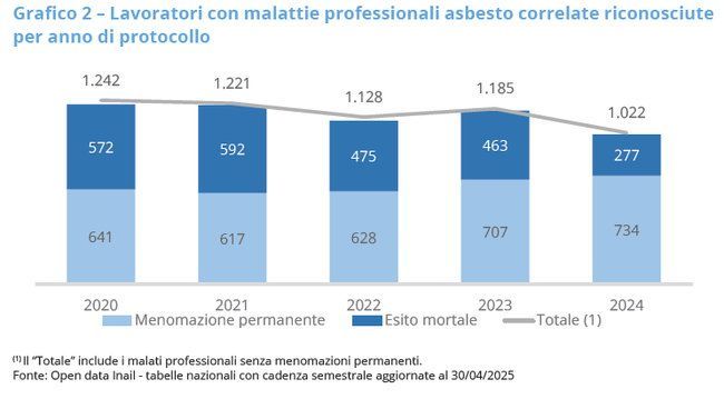 Si indica nel documento che, in controtendenza rispetto al complesso dei malati professionali, “i lavoratori affetti da malattie professionali asbesto-correlate decrescono nel periodo, passando da 1.242 nel 2020 a 1.022 nel 2024, con una diminuzione complessiva del -18%”.
