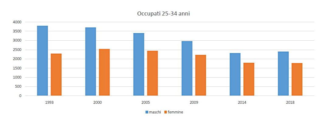 La relatrice riporta poi una serie di grafiche che mostrano anche il divario di occupazione tra maschi e femmine a diverse età. Riprendiamo le differenze tra i 25 e i 34 anni (sempre fonte Istat):