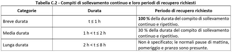 Viene introdotta una tabella che permette di verificare che i pesi sollevati e trasportati cumulativamente nell'arco delle ore non superino certi valori e questi valori vanno ridotti quando ci si trovi in condizioni non ideali, sfruttando opportuni moltiplicatori di correzione.