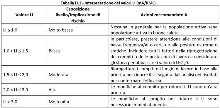 Riguardo poi al calcolo dell'indice di sollevamento (LI) a differenza della precedente norma, la nuova ISO 11228-1 riporta una tabella per classificare a fasce i valori di indice di sollevamento calcolati.