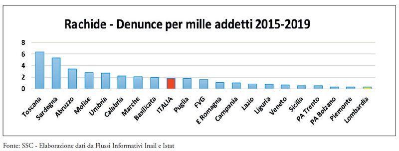 Si indica che dopo aver analizzato i dati nazionali - “rilevando come effettivamente le malattie muscoloscheletriche rappresentino la quota di gran lunga più significativa tra le malattie denunciate in Italia” e come in seno a tale classe di patologie, “i disturbi a carico del rachide, in correlazione a movimentazione manuale di carichi o vibrazioni trasmesse a corpo intero, siano i più frequenti” – si è verificato che la numerosità assoluta di tali patologie in Italia non corrisponde a una omogenea distribuzione sul territorio.