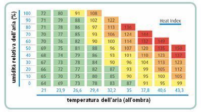 Viene riportata, a questo proposito, la “Carta dell’indice di calore” elaborata dall’Istituto Nazionale Francese per la Ricerca sulla Sicurezza, che fornisce l’indice di pericolosità, in relazione alla temperatura dell’aria (misurata con un termometro) e l’umidità dell’aria (misurata con un igrometro). Si segnala che gli “indici riportati sono validi per lavoro all’ombra quanto tira un vento leggero”.