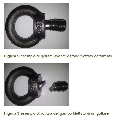 E il “rischio principale di sicurezza associato al loro uso è connesso alla caduta del carico a causa di rottura dell’ accessorio di sollevamento. Tra i fattori che possono determinare la rottura dell’accessorio di sollevamento rientrano: errata scelta del golfare in relazione al carico da sollevare, cattivo stato di manutenzione, ecc.”.