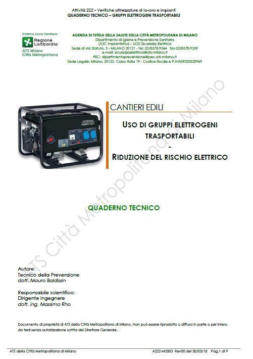 Un quaderno tecnico, a cura del dott. Mauro Baldissin (Tecnico della Prevenzione), che, benchè non recente (è del 2018), riporta utili indicazioni e presenta una possibile lista di controllo correlata all’uso di gruppi elettrogeni trasportabili.
