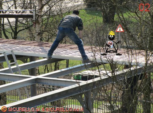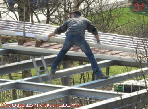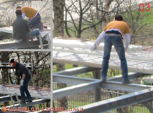 Nelle sequenza fotografica che pubblichiamo oggi vediamo due operai che, forse credendo di essere ad un’esibizione di ginnastica artistica, procedono nella posa di pannelli di copertura con pose acrobatiche ed assurdi equilibrismi.