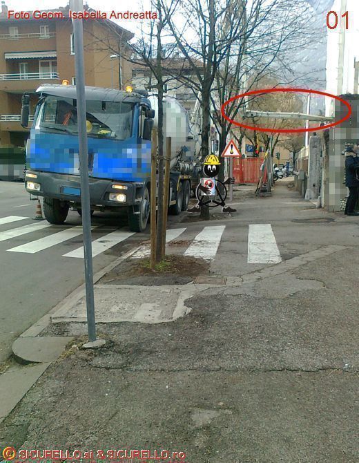 Dalle immagini è evidente che il braccio della betonpompa sorvola il marciapiede e non risulta presente alcuna protezione (attiva o passiva) dei pedoni che abbiano a passare sotto di esso, ricordiamo che esiste il divieto di transito o sosta nel raggio d’azione del braccio della pompa stessa.