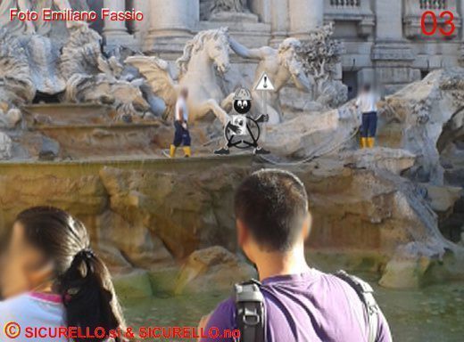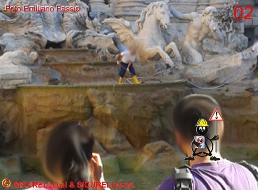 In particolare si vedono due operatori che stanno eseguendo dei lavori di pulizia della fontana. L’ordinario flusso d’acqua è stato ridotto al minimo e gli operai sono posizionati a rimuovere lo strato di alghe e mucillaggine che si è formata. Il rischio di scivolamento e/o caduta con conseguenti urto contro gli elementi lapidei della fontana è più che evidente.