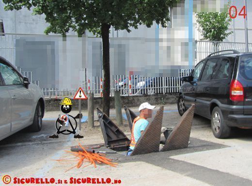 Avvicinandosi si vede che la “spazzatura” è in realtà del materiale di cantiere, mentre sul lato opposto si scorgono la testa ed il busto di un operaio che sta eseguendo la propria attività lavorativa all’interno del pozzetto aperto.