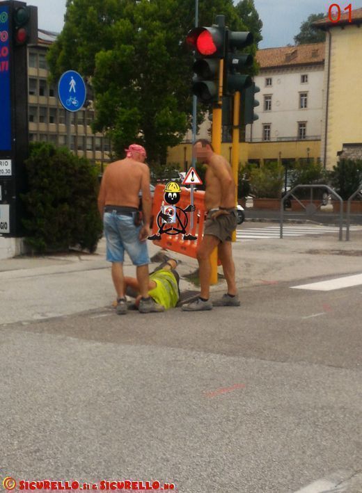 Trento, 5 Ago - Siamo ormai ad agosto ed il caldo dell’estate ci invoglia a prendere la classica tintarella e probabilmente è questo il motivo che spinge i due operai, immortalati nelle immagini dell’insicurezza di SICURELLO.no di oggi, a dimenticarsi di lavorare su una strada aperta al traffico veicolare e utilizzare invece un abbigliamento che ricorda da vicino le tranquille passeggiate al mare od in montagna.