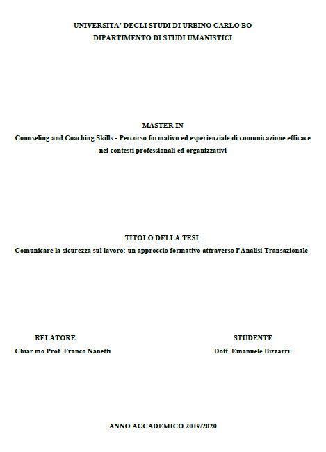 A presentare in questi termini l’ importanza della comunicazione e a proporre un modulo didattico specifico su questi temi, sempre con l’obiettivo di migliorare il coinvolgimento, la consapevolezza e l’adozione di comportamenti sicuri, è una tesi presentata da Emanuele Bizzarri - per il master in “Counseling and Coaching Skills - Percorso formativo ed esperienziale di comunicazione efficace nei contesti professionali ed organizzativi” dell’ Università degli studi di Urbino Carlo Bo - dal titolo “Comunicare la sicurezza sul lavoro: un approccio formativo attraverso l’Analisi Transazionale”.