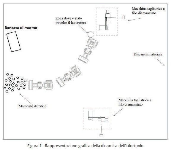 Si indica che i lavoratori della cava “stavano effettuando diverse lavorazioni, disposte dal Direttore Responsabile. Alcuni stavano seguendo l’esecuzione di tagli al monte ed altri, compreso l’infortunato, rispettivamente posizionati alle proprie centraline di comando, stavano seguendo alcuni tagli di riquadratura di blocchi con macchina tagliatrice a filo diamantato nel piazzale della cava. Durante tali lavorazioni, il palista stava effettuando la movimentazione di detrito transitando nel piazzale. L’infortunato si è spostato dalla propria centralina per andare a controllare il corretto posizionamento del filo sul retro del blocco. Giunto dietro al blocco, veniva investito dalla pala meccanica gommata che stava effettuando una manovra in retromarcia. Il palista non si è accorto dell’incidente ed ha ripreso la sua marcia in avanti”.