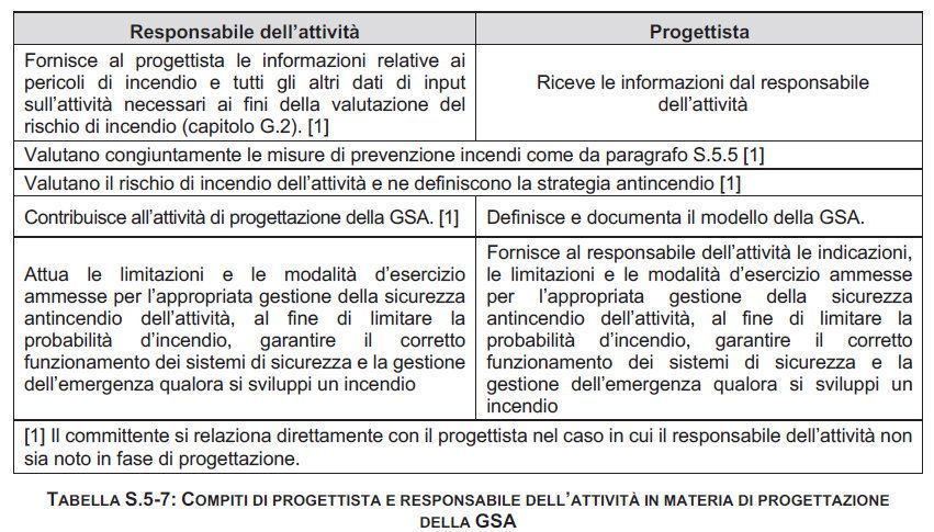 Il quaderno si sofferma sulla progettazione della gestione della sicurezza e indica che una corretta progettazione “implica uno scambio di informazioni tra progettista e responsabile dell'attività come indicato in tabella S.5-7”. E il processo progettuale descritto nella tabella S.5-7 “deve essere esplicitato nella relazione tecnica. Tutte le informazioni indispensabili al responsabile dell'attività per la gestione della sicurezza antincendio durante il normale esercizio ed in emergenza devono essere elencate in apposita sezione della relazione tecnica”.