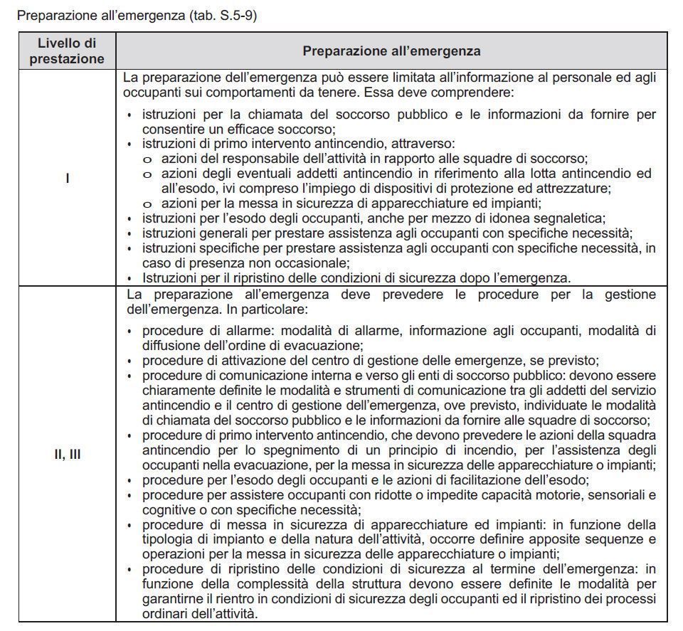 Si indica, inoltre, che la preparazione all'emergenza “deve includere planimetrie e documenti nei quali siano riportate tutte le informazioni necessarie alla gestione dell'emergenza, comprese le istruzioni o le procedure per l'esodo degli occupanti, indicando in particolare le misure di assistenza agli occupanti con specifiche necessità”.