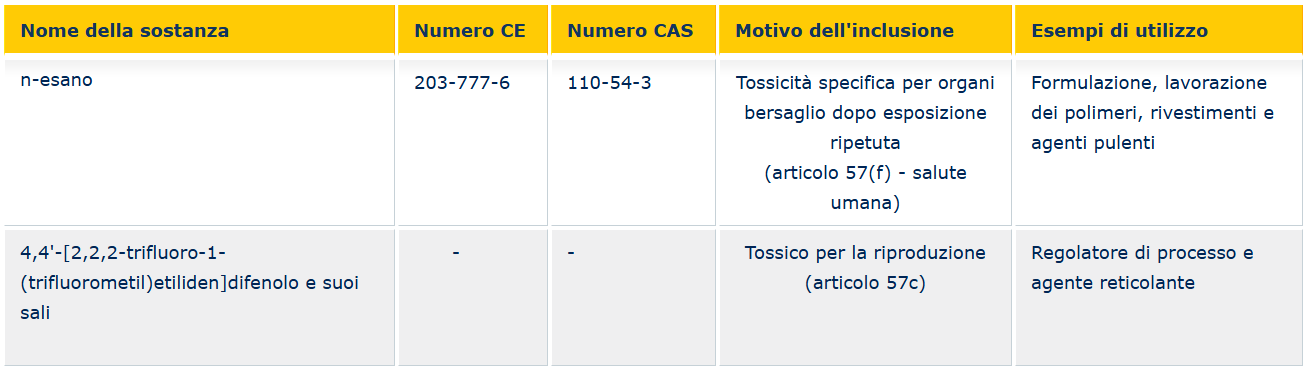 - 4,4'-[2,2,2-trifluoro-1-(trifluorometil)etiliden]difenolo e i suoi sali inclusa perchè "Tossico per la riproduzione (articolo 57c)" e utilizzata come "Regolatore di processo e agente reticolante"
