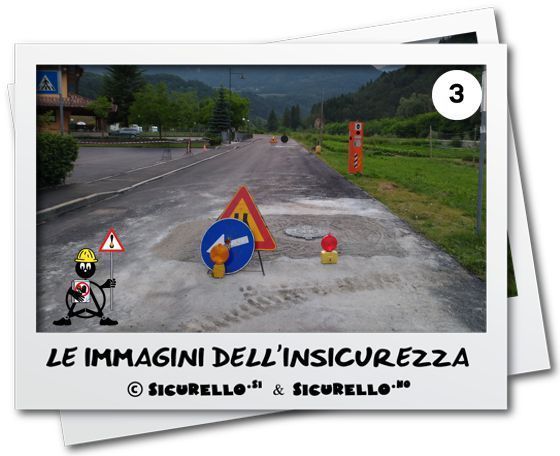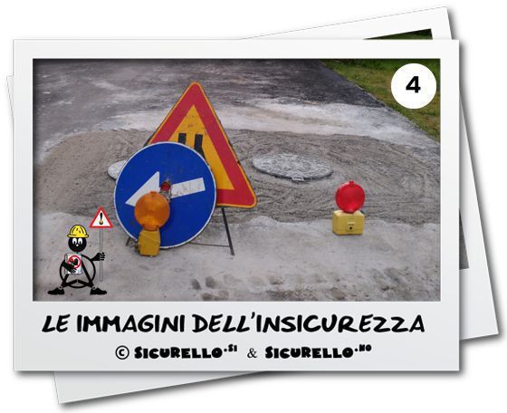 Il secondo esempio è legato ai lavori di manutenzione di una strada (parzialmente aperta al traffico), dove l’ostacolo, costituito da alcuni chiusini in fase di riposizionamento, viene segnalato in un modo che definire “bizzarro” è certamente un eufemismo: