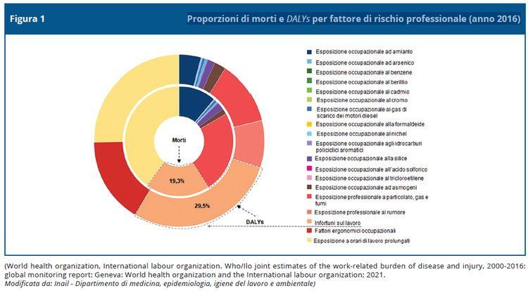 Tuttavia, altro dato interessante, si osserva che gli infortuni sul lavoro “rappresentano solo il 19,3% delle morti e il 29,5% dei DALYs, mentre oltre l’80% dei decessi e il 70% delle disabilità conseguenti a fattori di rischio professionali sono dovuti alle malattie professionali nel loro complesso”.