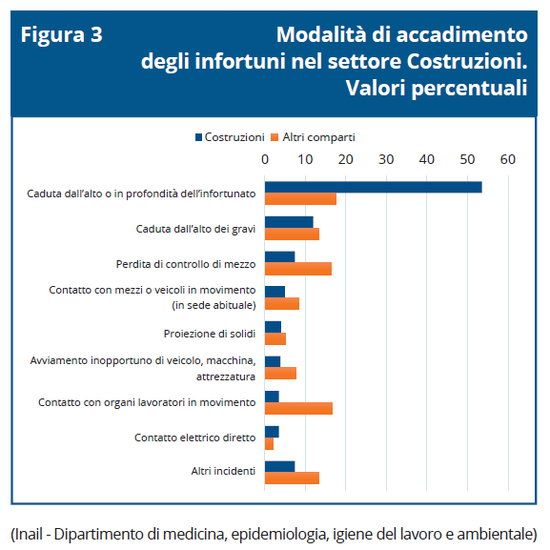 Il documento di InforMO - a cura di A. Guglielmi, A. Leva, G. Campo e V. Meloni (Inail, Dimeila), P. Conte (Regione Sicilia - Assessorato della salute DASOE) e A. Leonardi (Regione Sicilia, Dipartimento di prevenzione ASP) – ricorda le tipologie di incidenti più frequenti nel settore delle Costruzioni: “le cadute di lavoratori dall’alto, modalità che da sola raggruppa oltre la metà degli infortuni (54%), le cadute dall’alto di oggetti e carichi su lavoratori (12%), le perdite di controllo durante la conduzione di mezzi (7%)”.