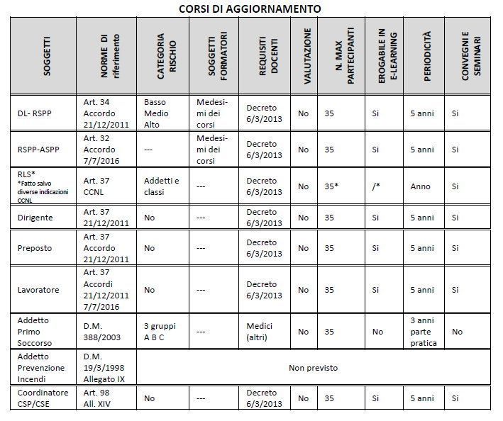 E si ricorda, a questo proposito, il contenuto del punto 9.1 dell’ Accordo in sede di Conferenza Permanente per i rapporti tra lo Stato, le Regioni e le Province Autonome di Trento e di Bolzano del 7 luglio 2016, “Accordo finalizzato alla individuazione della durata e dei contenuti minimi dei percorsi formativi per i responsabili e gli addetti dei servizi di prevenzione e protezione” che contiene, come più volte ricordato nei nostri articoli, anche modifiche e indicazioni relative alla formazione di vari attori della sicurezza aziendale.