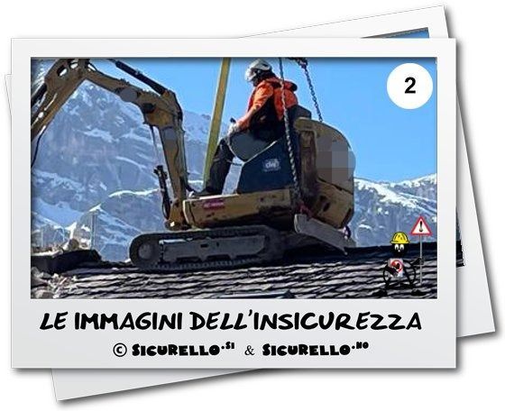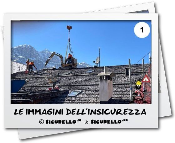 Le immagini dell’insicurezza di SICURELLO.no di oggi sono molto chiare: per effettuare delle demolizioni (camini? soletta di un vano scale od ascensore? altro manufatto), viene imbragato un miniescavatore e con la gru di cantiere portato in quota, appoggiato sul colmo del tetto ed utilizzato per effettuare le demolizioni.