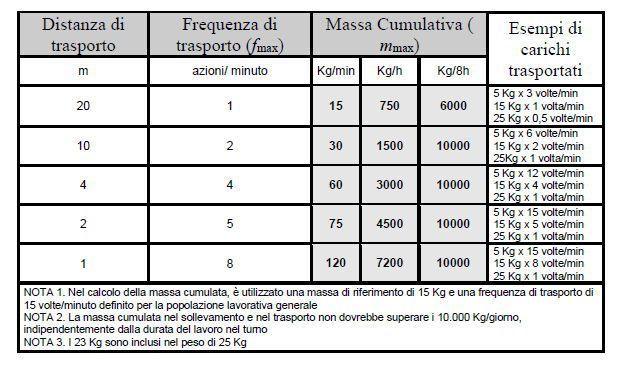 Si ricorda poi che in realtà “le masse cumulative effettivamente trasportate (in un minuto, ogni ora e nell’intero turno), possono essere comparate con quelle rispettivamente raccomandate in un ideale indice di trasporto (Massa cumulativa effettiva / massa cumulativa raccomandata) del tutto analogo al LI (Lifting Index, ndr) per il sollevamento (ove Indice > 1 : RISCHIO)”.