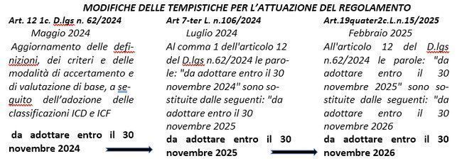 All’art.33, 1 c. si legge che dal 1° gennaio 2025, anche al fine di assicurare il progressivo aggiornamento delle definizioni, dei criteri e delle modalità di accertamento, è avviata una procedura di sperimentazione della durata di dodici mesi, volta all’applicazione provvisoria e a campione delle disposizioni relative alla valutazione di base disciplinata dal Capo II del presente decreto, e nel suddetto capo all’art.12 si legge chiaramente “Aggiornamento delle definizioni, dei criteri e delle modalità di accertamento e di valutazione di base, a seguito dell’adozione delle classificazioni ICD e ICF… con regolamento del Ministro della salute, da adottare entro il 30 novembre 2024 …si provvede, sulla base delle classificazioni ICD e ICF e in conformità con la definizione di disabilità di cui all’articolo 2, comma 1, lettera a), all’aggiornamento delle definizioni, dei criteri e delle modalità di accertamento dell’invalidità civile, della cecità civile, della sordità civile e della sordocecità civile previsti dal decreto del Ministro della sanità 5 febbraio 1992, pubblicato nella Gazzetta Ufficiale n. 47 del 26 febbraio 1992”