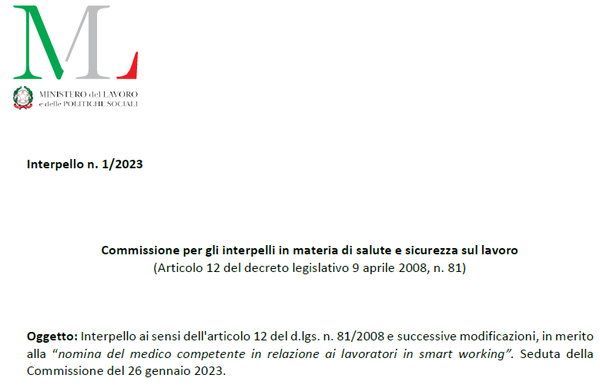 A dare qualche informazione su come interpretare la normativa, in materia di salute e sicurezza, in relazione alle attività in smart working, interviene l’Interpello n. 1/2023 pubblicato il primo febbraio 2023 e approvato nella seduta della Commissione del 26 gennaio 2023. Interpello che ha per oggetto “Interpello ai sensi dell'articolo 12 del d.lgs. n. 81/2008 e successive modificazioni, in merito alla ‘nomina del medico competente in relazione ai lavoratori in smart working’. Seduta della Commissione del 26 gennaio 2023”.