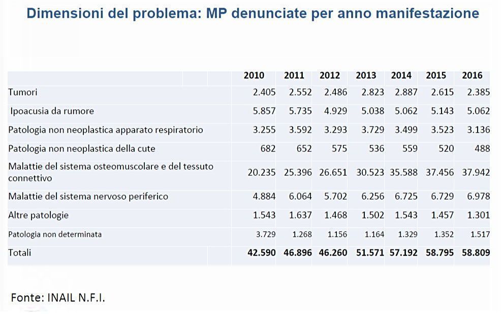 Riprendiamo dalle slide dell’intervento una tabella relativa alle malattie professionali denunciate (nel documento è presente anche la tabella delle malattie riconosciute):