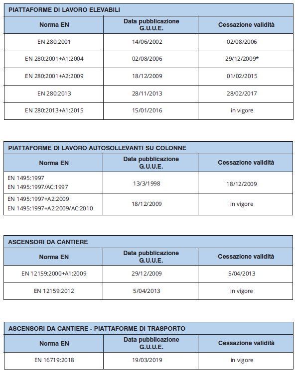 Riprendiamo dal documento Inail alcune norme di tipo C “riferibili alle tipologie di macchine che afferiscono al gruppo SP”: per ciascuna tipologia di apparecchio di sollevamento persone, ove disponibili, sono stati riportati i riferimenti delle norme applicabili, esplicitando la data di pubblicazione in gazzetta ufficiale, quale riferimento per lo stato dell’arte e per la presunzione di conformità.