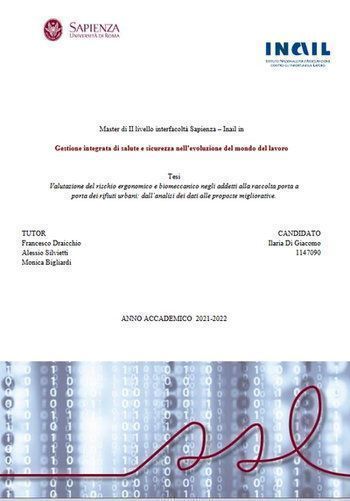 “ Valutazione del rischio ergonomico e biomeccanico negli addetti alla raccolta porta a porta dei rifiuti urbani: dall’analisi dei dati alle proposte migliorative”, anno accademico 2021-2022, tesi di Ilaria Di Giacomo per il Master di II livello interfacoltà Sapienza – Inail in Gestione integrata di salute e sicurezza nell’evoluzione del mondo del lavoro (formato PDF, 1.19 MB).