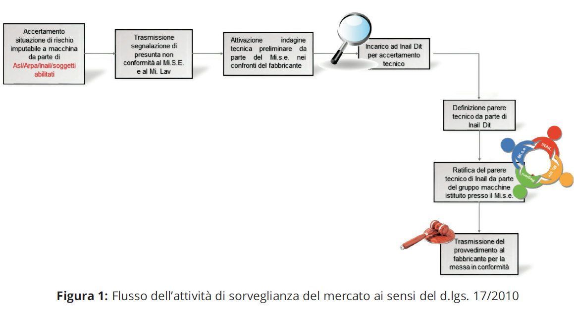 Riportiamo dal documento una figura che sintetizza il processo di sorveglianza del mercato, “così come è stato strutturato sul territorio nazionale, evidenziando le diverse figure che partecipano all’iter che va dalla formulazione della segnalazione di presunta non conformità (attivata da organi di vigilanza territoriale nell’espletamento delle loro attività di vigilanza o di indagini per infortuni, verificatori nello svolgimento delle attività tecniche di cui all’art. 71 comma 11 del d.lgs. 81/08 e s.m.i., o nel caso, autorità giudiziarie, ecc.) all’adozione di un provvedimento da parte del Ministero dello sviluppo economico, sulla base dell’accertamento tecnico redatto da Inail”.