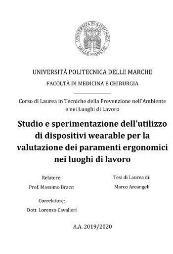 La tesi - “Studio e sperimentazione dell’utilizzo di dispositivi wearable per la valutazione dei parametri ergonomici nei luoghi di lavoro” - è stata realizzata, nell’anno accademico 2019/2020, da Marco Arcangeli per il Corso di Laurea in Tecniche della Prevenzione nell’Ambiente e nei Luoghi di Lavoro presso l’ Università Politecnica delle Marche.
