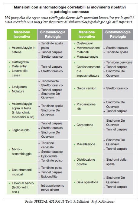 Dal documento riprendiamo una interessante tabella che riepiloga alcune delle mansioni lavorative per le quali è stata accertata una maggiore frequenza di sintomatologie/patologie agli arti superiori: